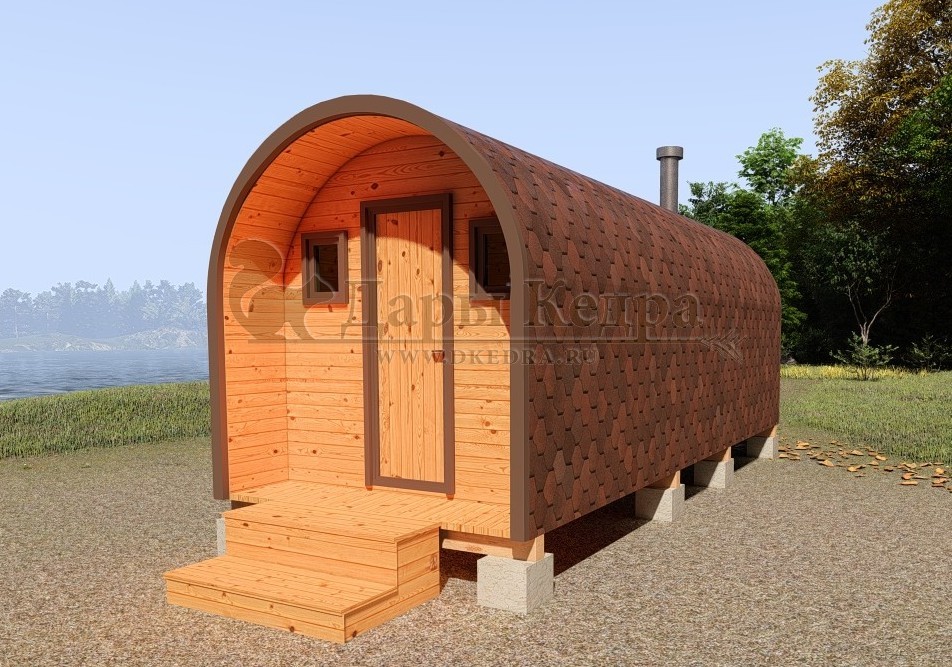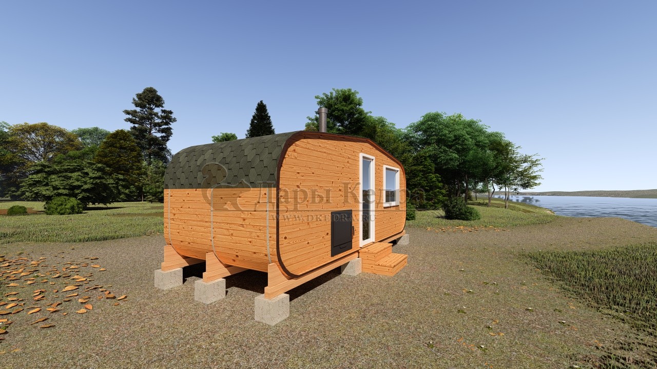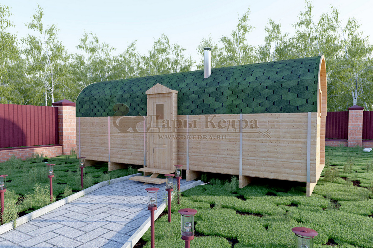 Баня-бочка буханка из кедра с козырьком (все размеры) Баня-буханка более просторная за счет увеличенной высоты потолков и ровного пола. Козырек не только украшает баню, но и защищает оставленную обувь от дождя. Лавочки из кедра находятся по всей длине бани-бочки с обеих сторон. Печь расположена в парилке около дальней стены. Время растопки такой бани не превышает 30 минут. В зависимости от выбранного размера баня-бочка буханка с козырьком имеет следующую комплектацию: Баня-бочка буханка 2,5 метра - парилка; Баня-бочка буханка 3,5 и 4,5 метра - раздевалка, парилка; Баня-бочка буханка 5,5 метров - раздевалка, парилка, моечная. По вашему желанию ее можно укомплектовать печью с внешней загрузкой, благодаря которой весь мусор вовремя топки остается на улице. Баня-бочка буханка не требует полноценный фундамент, поэтому при необходимости ее можно перенести в другое место. Обращаем Ваше внимание, что в стандартную комплектацию бани входят полки открытого типа в парной с обеих сторон. Дополнительно можно заказать полок закрытого типа или лавку! Кедр обладает ароматическими свойствами. Он не деформируется и влагоустойчив, при правильном уходе за деревом на нем не развиваются грибки и плесень.