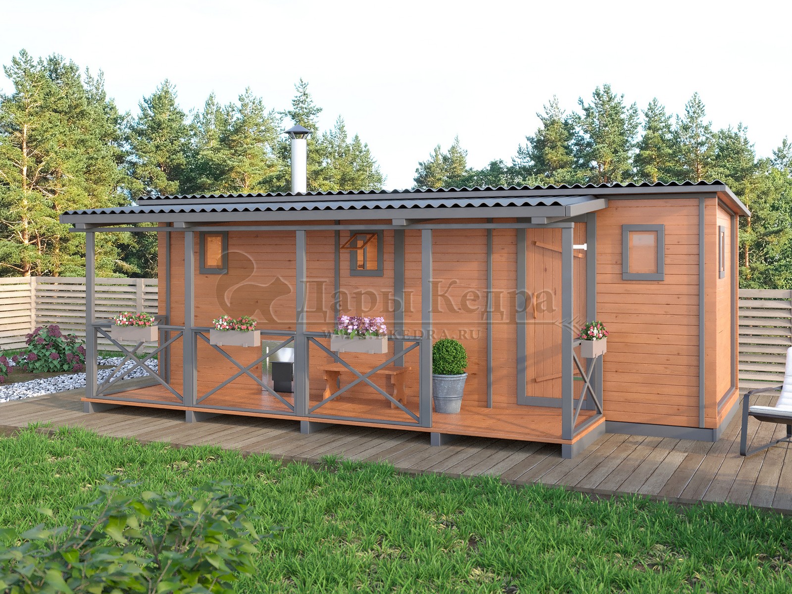Каркасно-щитовая баня из кедра «Макси» с верандой Это классическая прямоугольная модель бани с тремя отделениями: предбанником, моечной и парилкой. Для удобства пользования предбанник оснащен лавочкой и вешалкой. В моечной находится лавка и полочка из кедра. Парилка оборудована двухуровневым открытым полком и печью. Время растопки такой бани не превышает 30 минут. На просторной веранде можно оставить вещи или отдохнуть после парения. Каркасно-щитовую баню можно заказать как в готовом, так и в разборном варианте. В разборной модели готовые щиты из кедра быстро собираются в полноценное строение, что также позволяет исключить лишний строительный мусор. Такая баня не требует полноценный фундамент, поэтому при необходимости ее можно перенести в другое место. Обращаем Ваше внимание, что в стандартную комплектацию бани входит полок открытого типа в парной. Дополнительно можно заказать полок закрытого типа или лавку! Древесина кедра насыщена эфирными маслами и фитонцидами, которые активируются при воздействии температур. Таким образом, парение в каркаско-щитовых банях из кедра становится еще полезнее.