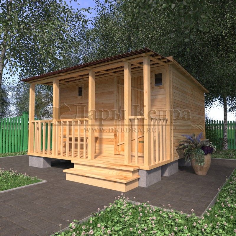 Каркасно-щитовая баня из кедра «Стандарт» с верандой Это классическая прямоугольная модель бани с тремя отделениями: предбанником, моечной и парилкой. Для удобства пользования предбанник оснащен лавочкой и вешалкой. В моечной находится лавка и полочка из кедра. Парилка оборудована двухуровневым открытым полком и печью. За счет небольших размеров баня нагревается не более 30 минут. На просторной веранде можно оставить вещи или отдохнуть после парения. Каркасно-щитовую баню можно заказать как в готовом, так и в разборном варианте. В разборной модели готовые щиты из кедра быстро собираются в полноценное строение, что также позволяет исключить лишний строительный мусор. Такая баня не требует полноценный фундамент, поэтому при необходимости ее можно перенести в другое место. Обращаем Ваше внимание, что в стандартную комплектацию бани входит полок открытого типа в парной. Дополнительно можно заказать полок закрытого типа или лавку! Древесина кедра насыщена эфирными маслами и фитонцидами, которые активируются при воздействии температур. Таким образом, парение в каркаско-щитовых банях из кедра становится еще полезнее.