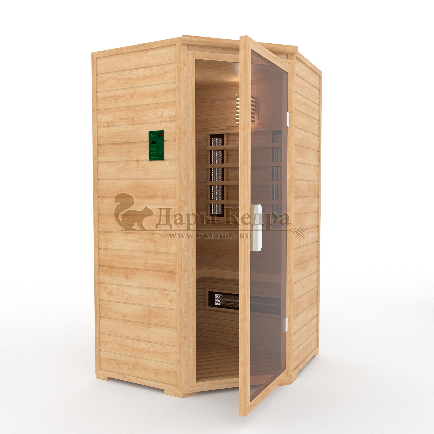Это специально оборудованная кедровая кабина для прогрева тела человека сухим теплом. Воздух в таких парных не нагревается. Инфракрасные лучи воздействуют на тело, равномерно прогревая мышцы, суставы и органы. Керамические излучатели похожи на лампы, имеют высокую температуру нагрева, поэтому защищены противоожоговыми решетками. Тело человека в таких саунах нагревается интенсивнее. Работает кабина за счет электричества. Установка сауны в угол, позволяет рационально использовать пространство помещения. Подходит как для домашнего использования, так и для коммерции.