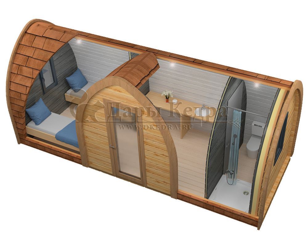 Кемпинг дом «Викинг» Экологичный утепленный дом 'Викинг' подходит для постоянного проживания на даче или для обустройства загородных баз отдыха. Оригинальная модель включает два помещения и позволяет рационально использовать внутреннее пространство. Кемпинг-дом предполагает два варианта размещения: Прихожая и комната со спальным местом; Комната со спальным местом и сауна с парилкой. Утепленный пол с покрытием (ламинат), пароизоляция под кровлей, панорамные окна, современная сантехника сделают пребывание на природе комфортным и безопасным круглый год.