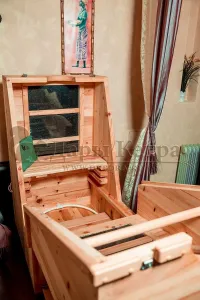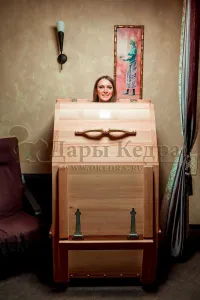 Квадратная двухрежимная фитобочка из кедра может быть использована как инфракрасная сауна и парная. Карбоновые излучатели отвечают за сухое парение, они находятся на внутренней стороне дверцы и задней стенке фитобочки. Влажное парение происходит за счет поступления горячего пара в фитобочку через паропровод. Толщина стенок составляет 40-45 мм, что позволяет увеличить срок службы изделия. Откидная дверь бочки во время открывания фиксируется внешней подставкой - опорой, которая в закрытом состоянии складывается и не занимает лишнее пространство. Во время парения человек сидит внутри кедровой бочки, а голова находится снаружи. Благодаря этому исключается возможность перегрева. Встроенная ручка на двери делают эксплуатацию фитобочки более удобной.