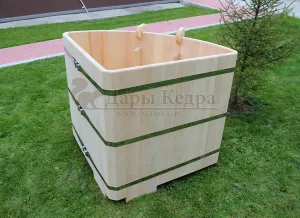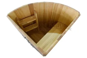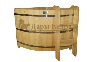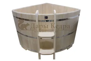 Это треугольная емкость для воды из кедра. Она предназначена для отдыха и охлаждения тела после банных процедур. Купель устанавливается в угол помещения, что идеально для не больших пространств. Так же подходит для уличного использования. Угловая купель оснащена лавочками, приставной и внутренней лестницей из кедра. За счет стяжных болтов обручи из нержавеющей стали плотно прилегают к кедровой купели. Это позволяет равномерно распределять нагрузку воды и сохранить форму изделия в период эксплуатации. При правильном уходе угловая купель для бани не рассыхается и не подвергается гниению.